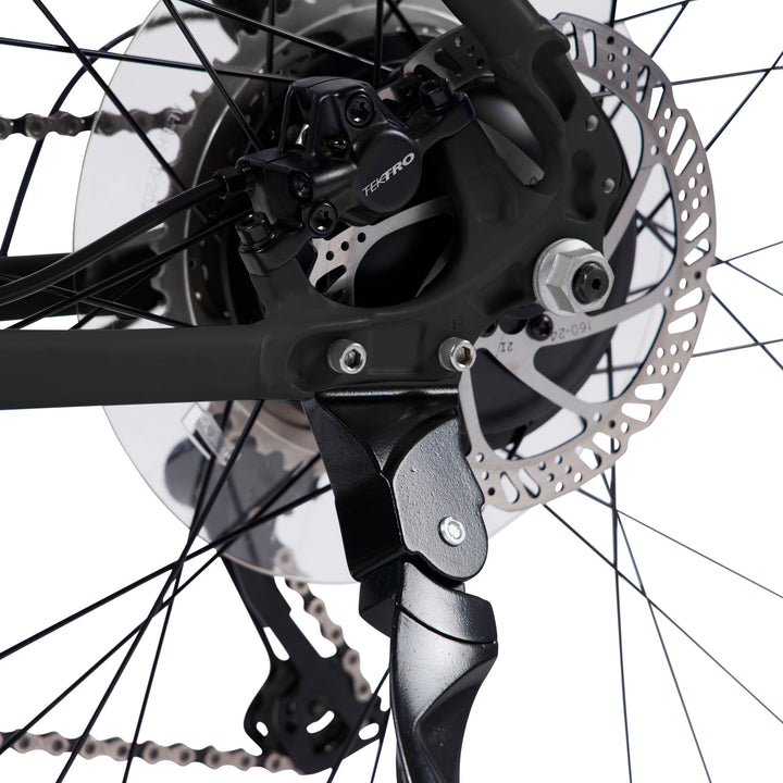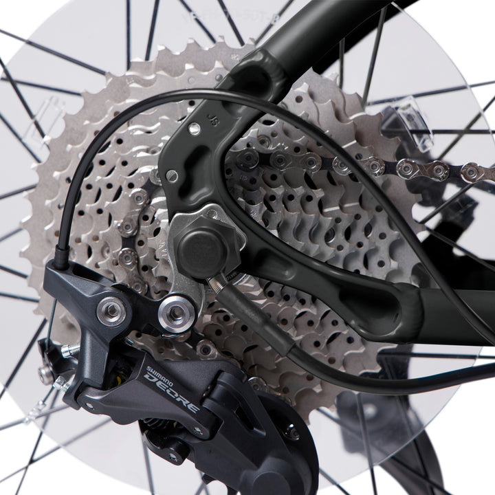Off-road tires, suspension fork and Shimano Deore 10-speed gear hubΒ