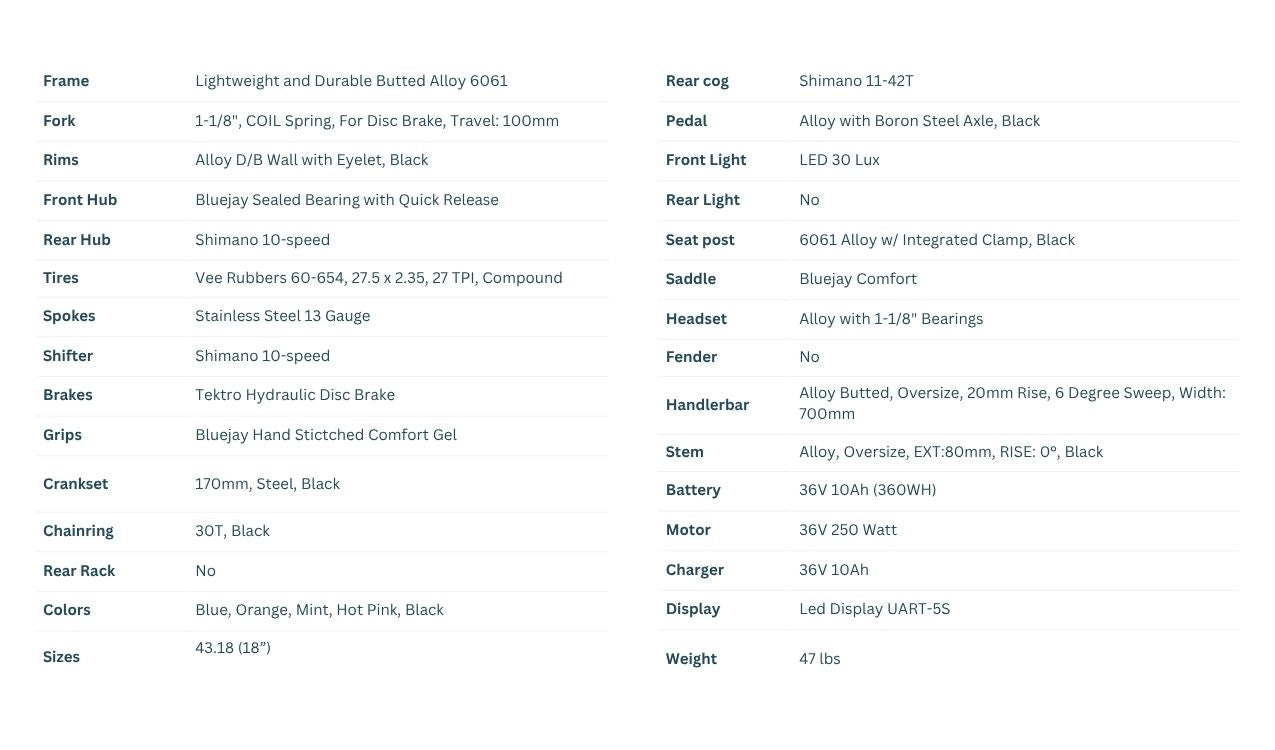 Built lightweight, with performance and versatility in mind, Bluejay WILD comes standard with all-road tires, front suspension, 5 levels of pedal assist, and a Shimano Deore 10-speed gear hub β delivering up to 50 miles between charges. Perfect for riders craving more adventure, Bluejay WILD is made to handle city streets, gravel paths, and everything in between.